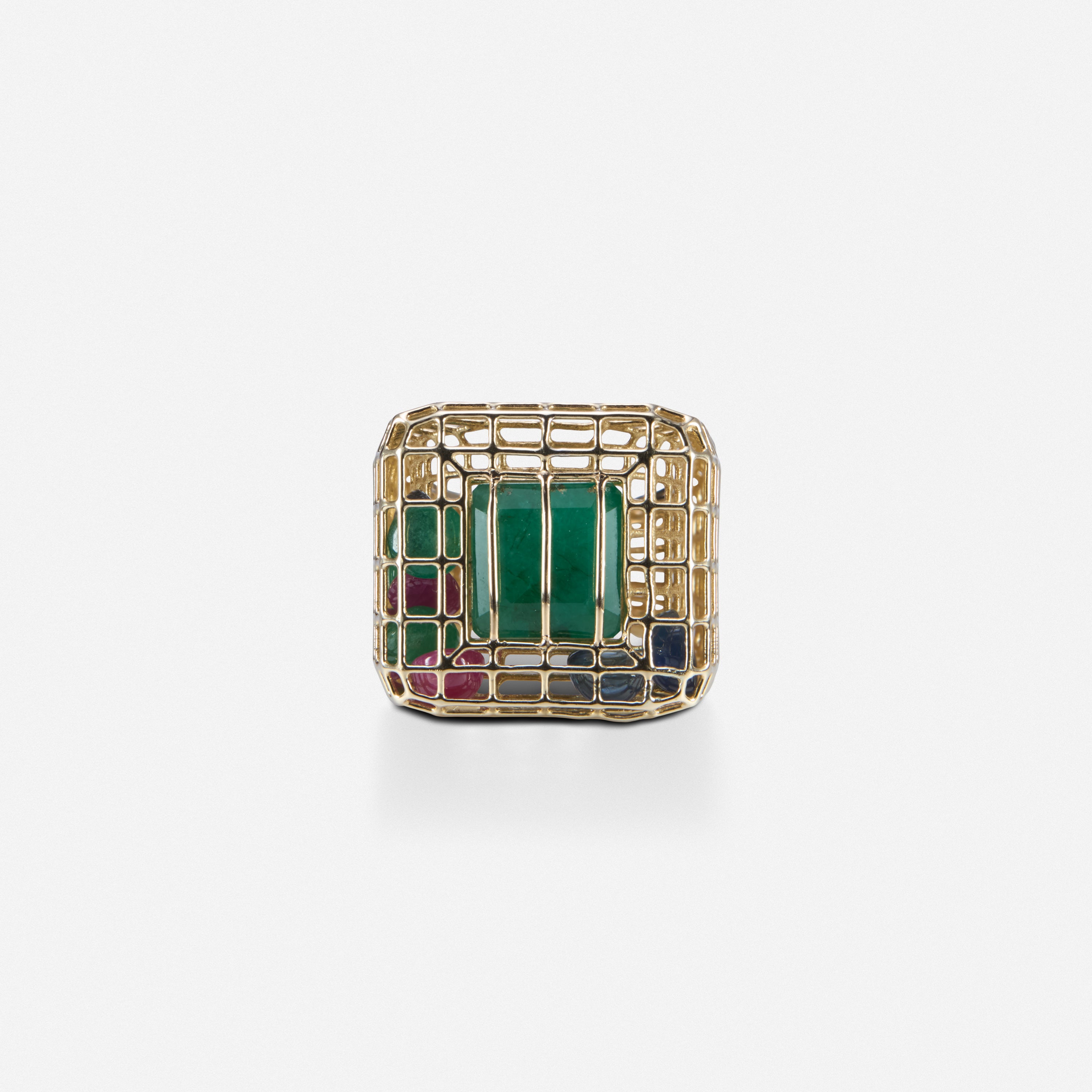 Yellow Gold with trapped center emerald, ruby, emerald and fancy blue sapphire inside, with an emerald cabochon