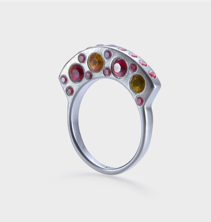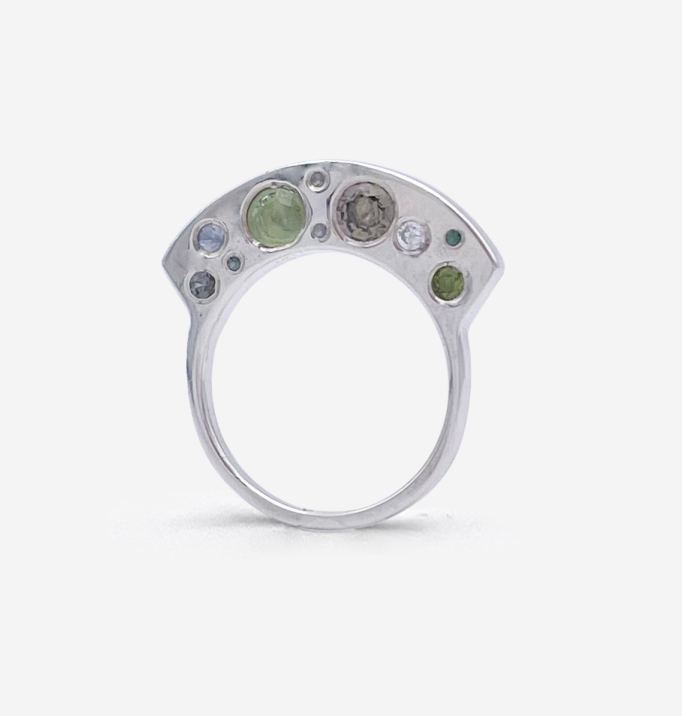 Designed to spin freely around the finger, each ring reveals different profiles as it moves—low curves, high points, exposed gems, or secret sparkle tucked away. They can be worn solo or stacked into playful, gear-like formations. Keep the stones turned inward for a private glimmer, or face them outward for a flash of rebellion.