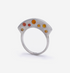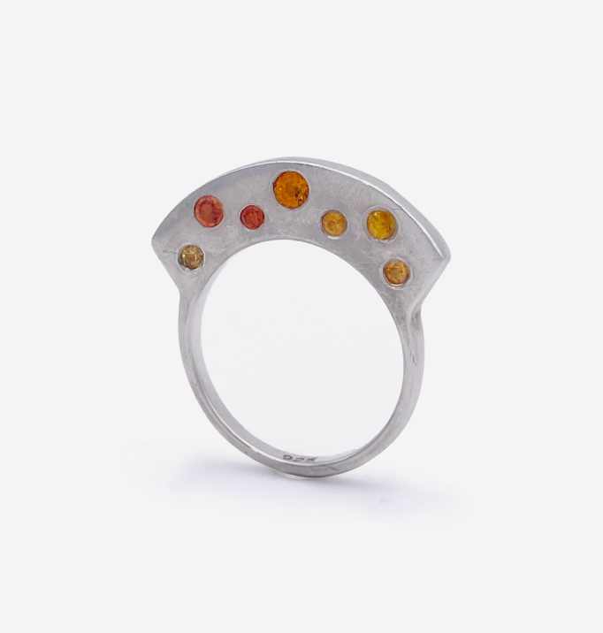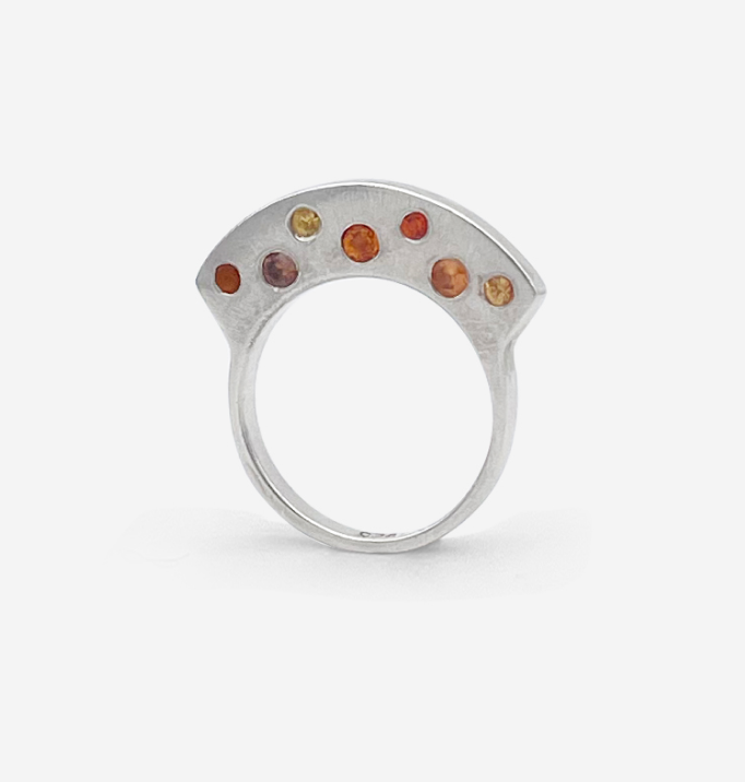 Stoned silver sonic with larger flushset sapphires on the side in the second highest profile with the addition of sapphires on top.  Wear them stacked to hide or show the stones from top of sides.