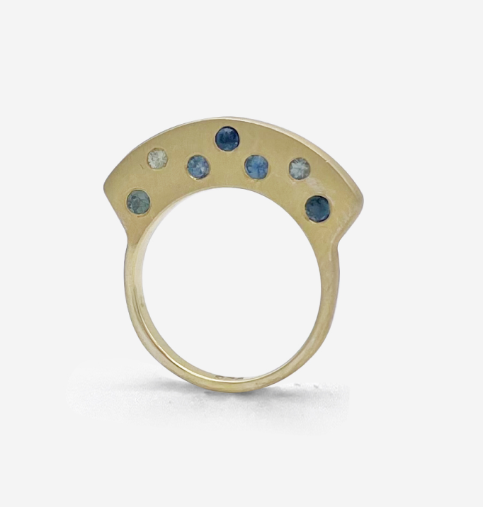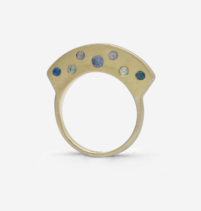 Stoned gold plated silver sonic with a range of blue and purple sapphires in the second highest profile.  Wear them stacked to hide or show the stones from top of sides.