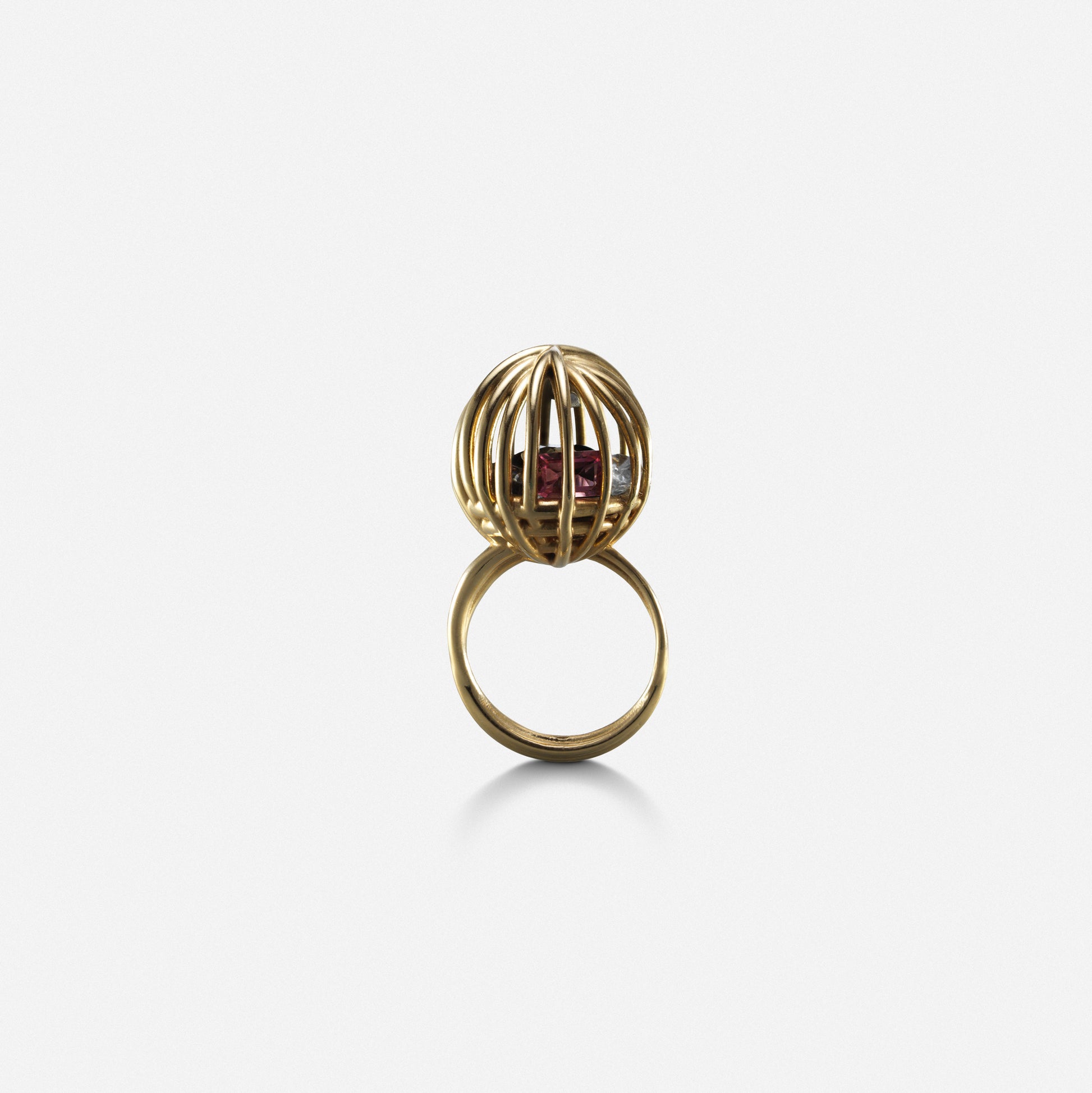 Gold Rattled ring with four stones set inside composed of ruby, sapphires and black diamonds.