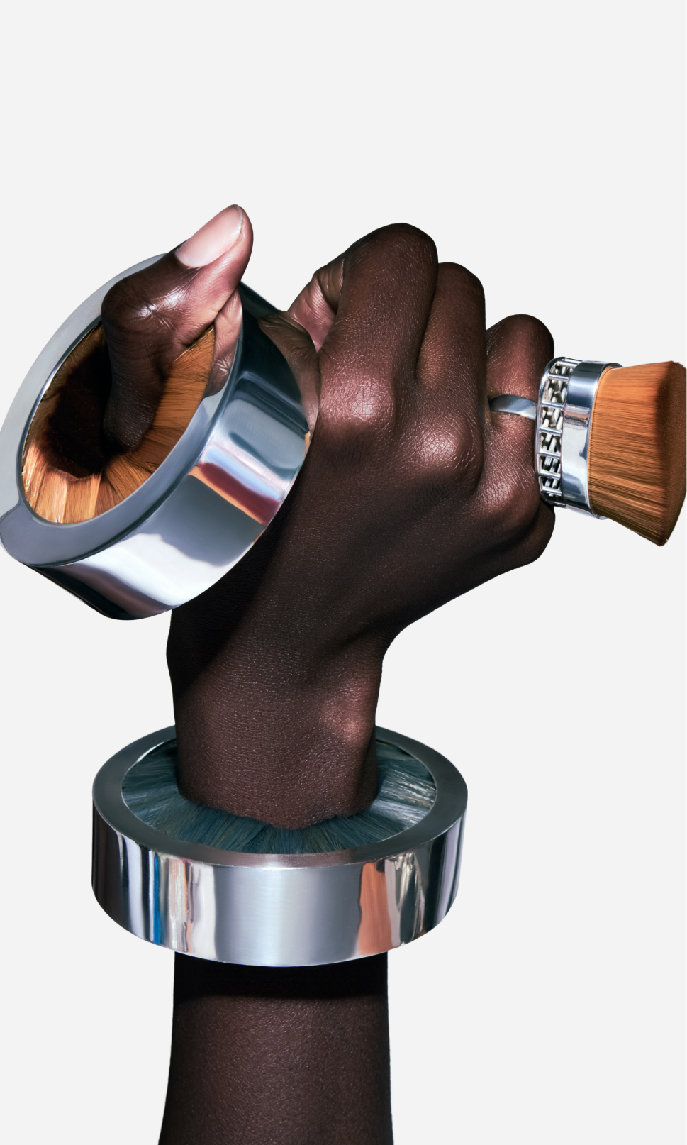 Feel the warm pressured embrace of the soft makeup brushes without ever touching the metal. They cradle your wrist .As much sculpture as jewellery.